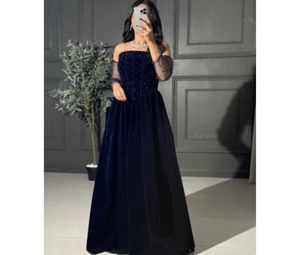فستان سهرة شتوي مخمل بلون كحلي بقصة أوف شولدر