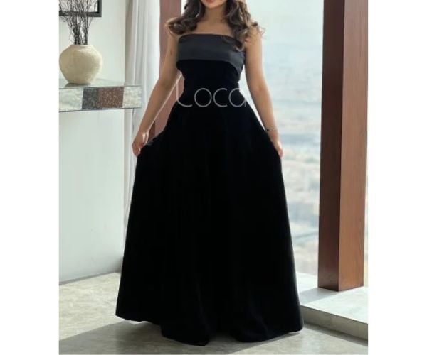 فستان سهرة أسود طويل أنيق من الجوخ بلون أسود