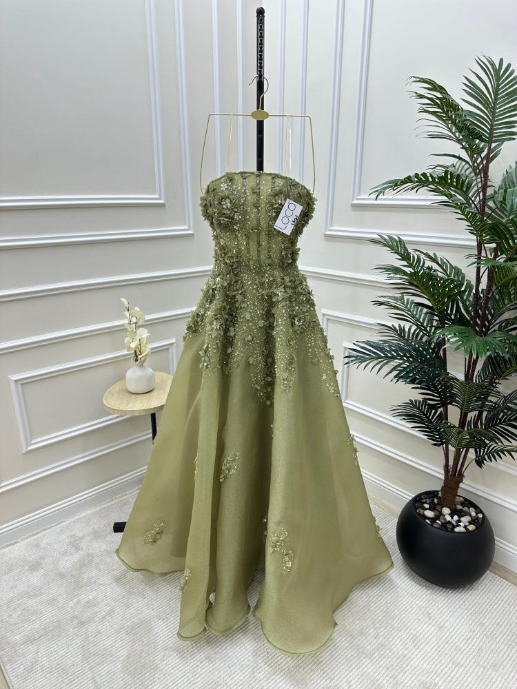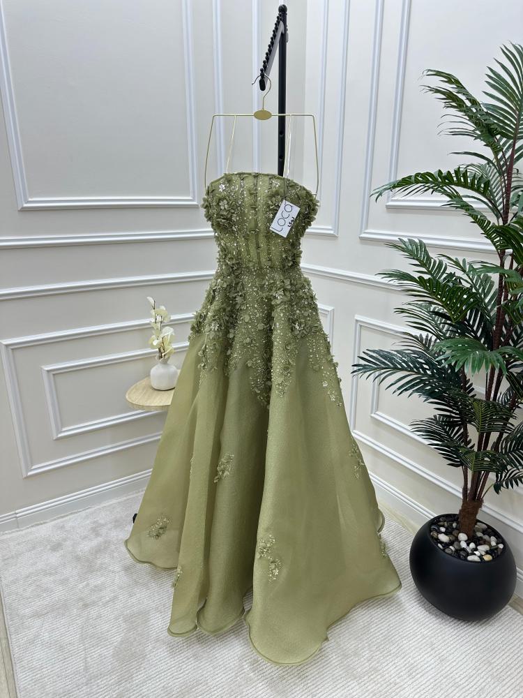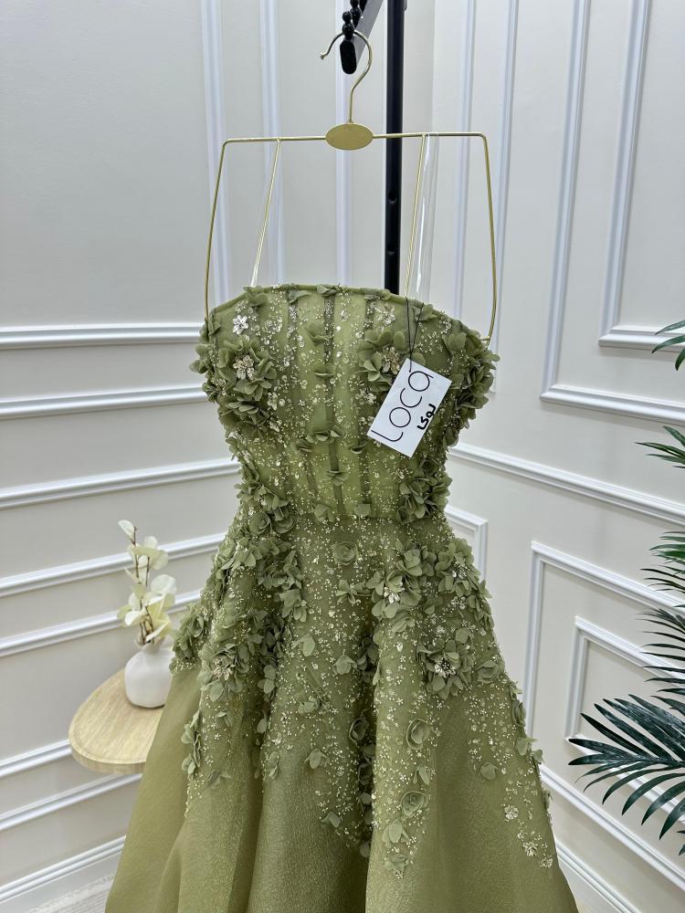 اطلبي الأن فستان سهره زيتي مع تطريز فاخر
