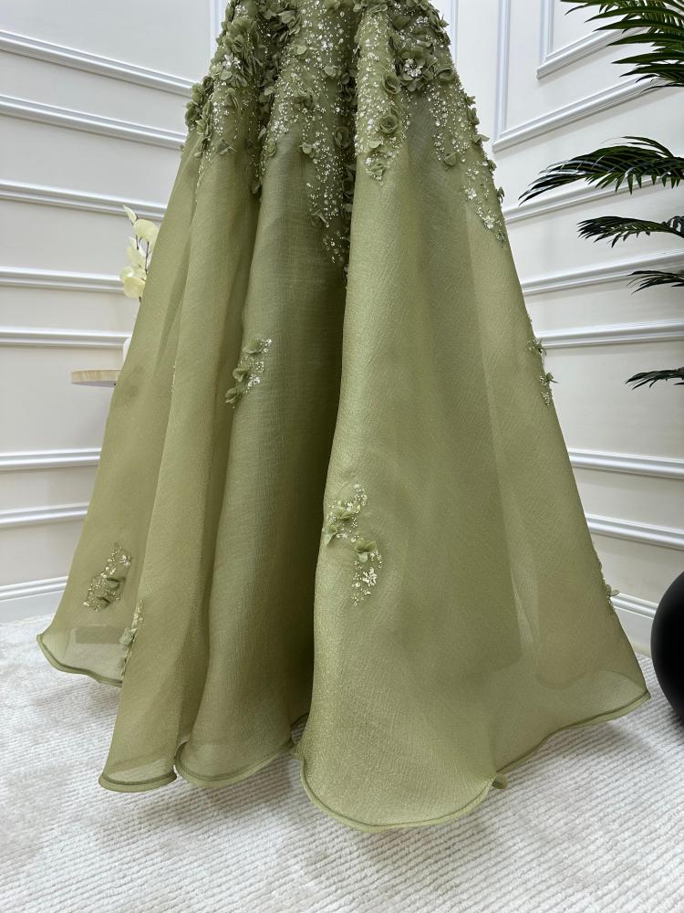 هذا الفستان الفخم هو مفخرة للملكات والعرائس. مصنوع من أفخر الأقمشة الخضراء الناعمة، والمزين بأزهار بيضاء رائعة التي تضفي لمسة من الأناقة والجمال. التصميم مذهل، مع تنورة طويلة وواسعة تضفي على اللبسة حركة أنيقة.