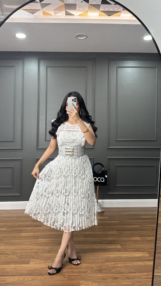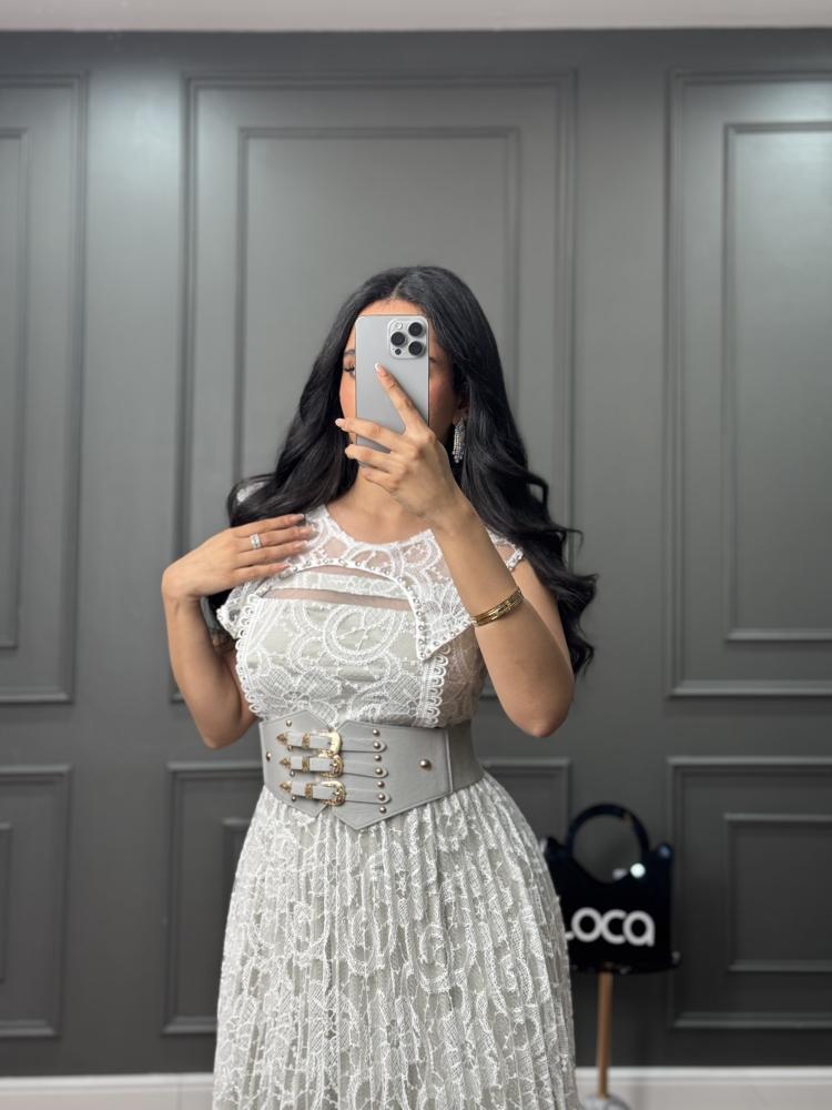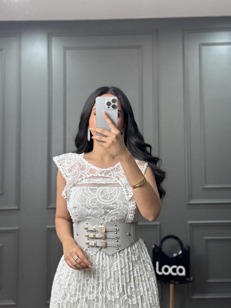 فستان ناعم بتكسيرات بيليسيه وحزام عريض من لوكا فاشن