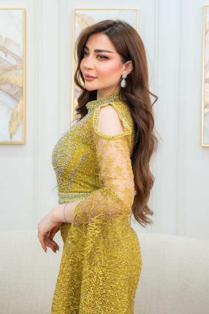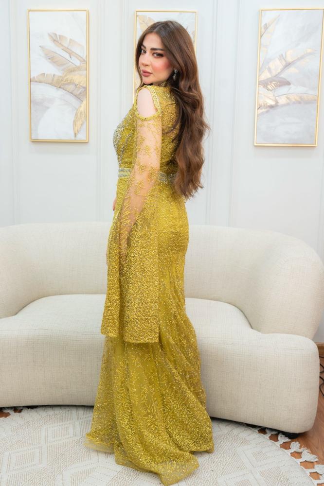 فستان سهره مطرز كامل لون زيتي بتصميم لوكا فاشن
