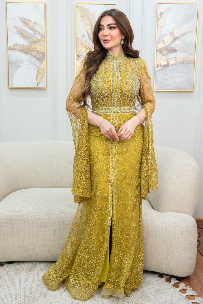 أطلبي الان : فستان سهره مطرز كامل لون زيتي بتصميم لوكا فاشن
