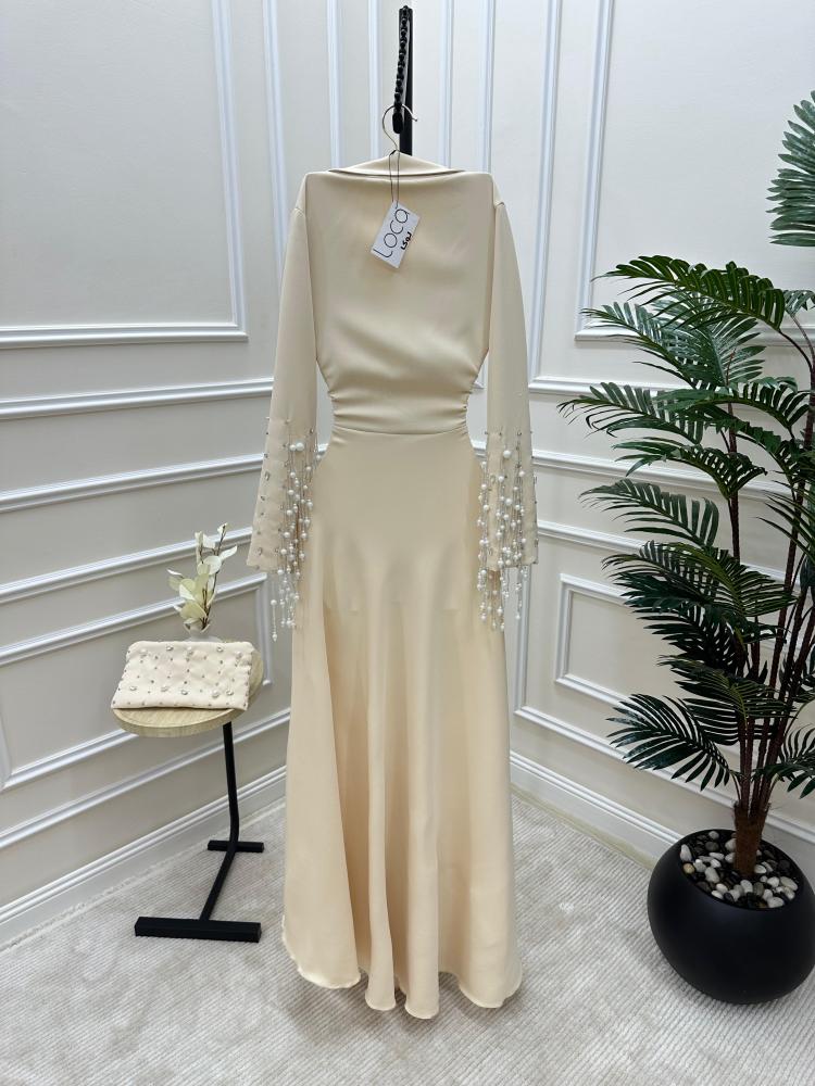 فستان أنيقًا وجذابًا بلون سكري يتميز بتصميم عصري مع ياقة مرتفعة، مما يضيف لمسة فاخرة. الأكمام طويلة ومزينة بتفاصيل لامعة، مما يمنح الفستان طابعًا مميزًا ومشوقًا. القصة تنسجم مع الجسم، مما يبرز الشكل بطريقة أنثوية. هذا الفستان مثالي لمناسبات السهرات أو الحفلات، حيث يجمع بين الأناقة والراحة