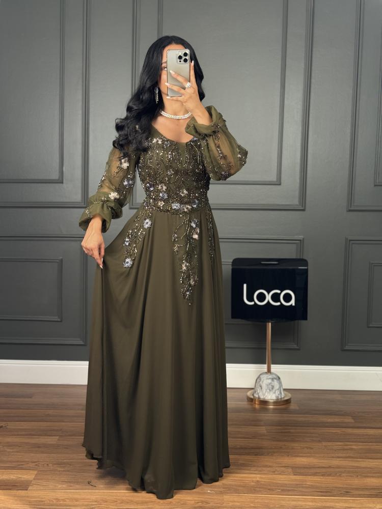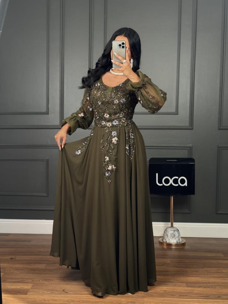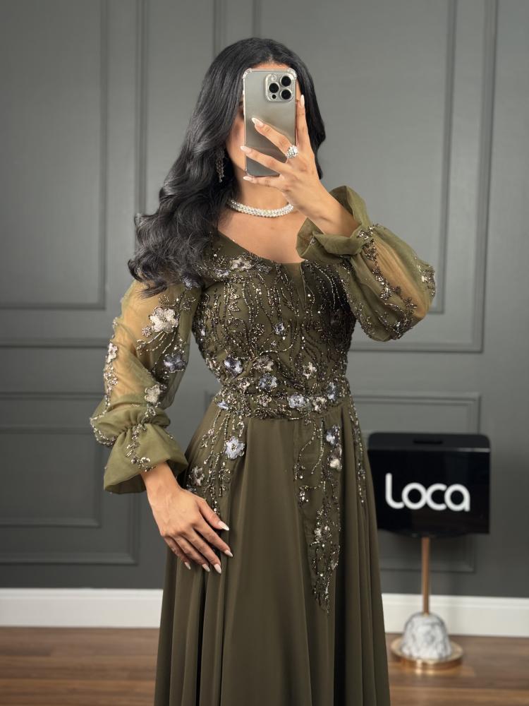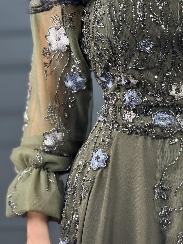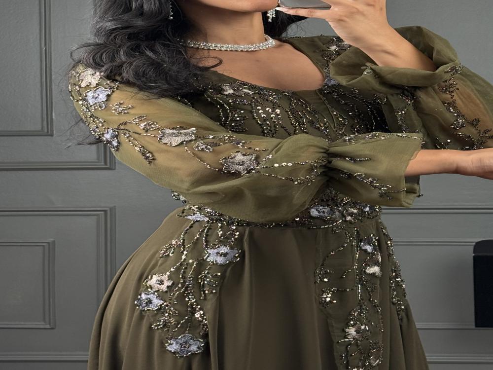 فستان “غصون الورد” هو تجسيد حقيقي للفخامة الراقية والأناقة الهادئة. يأتي بلونه الزيتي العميق الذي يضفي طابعًا ملكيًا أنثويًا، ويتناثر عليه تطريز فاخر بألوان متلألئة على شكل زهور وأغصان برّاقة تُشبه حدائق راقية تنبض بالحياة. التصميم المتقن وانسيابية القماش تجعل هذا الفستان الخيار المثالي لكل امرأة تبحث عن حضور استثنائي في سهراتها.