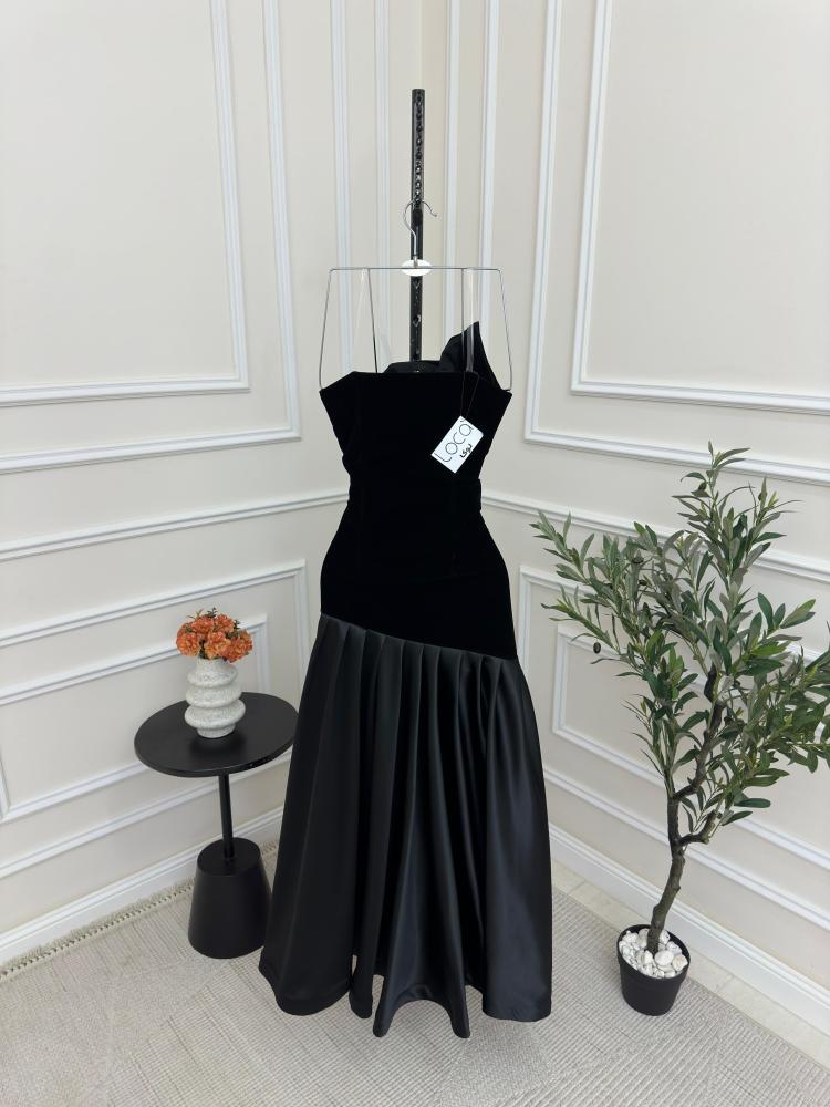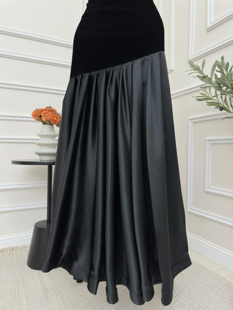 الفستان المخمل الأسود بكسرات من الأرداف من قماش التفتة هو تصميم فاخر يعكس الأناقة الكلاسيكية مع لمسة عصرية. المخمل الأسود يضفي فخامة وأناقة، بينما الكسرات التي تبدأ من الأرداف تمنح الفستان حركة رائعة وتبرز منحنيات الجسم بشكل جذاب. قماش التفتة يزيد من فخامة الفستان بملمسه الفاخر واللمعة الخفيفة، مما يجعله خيارًا مثاليًا للمناسبات الرسمية أو السهرات.