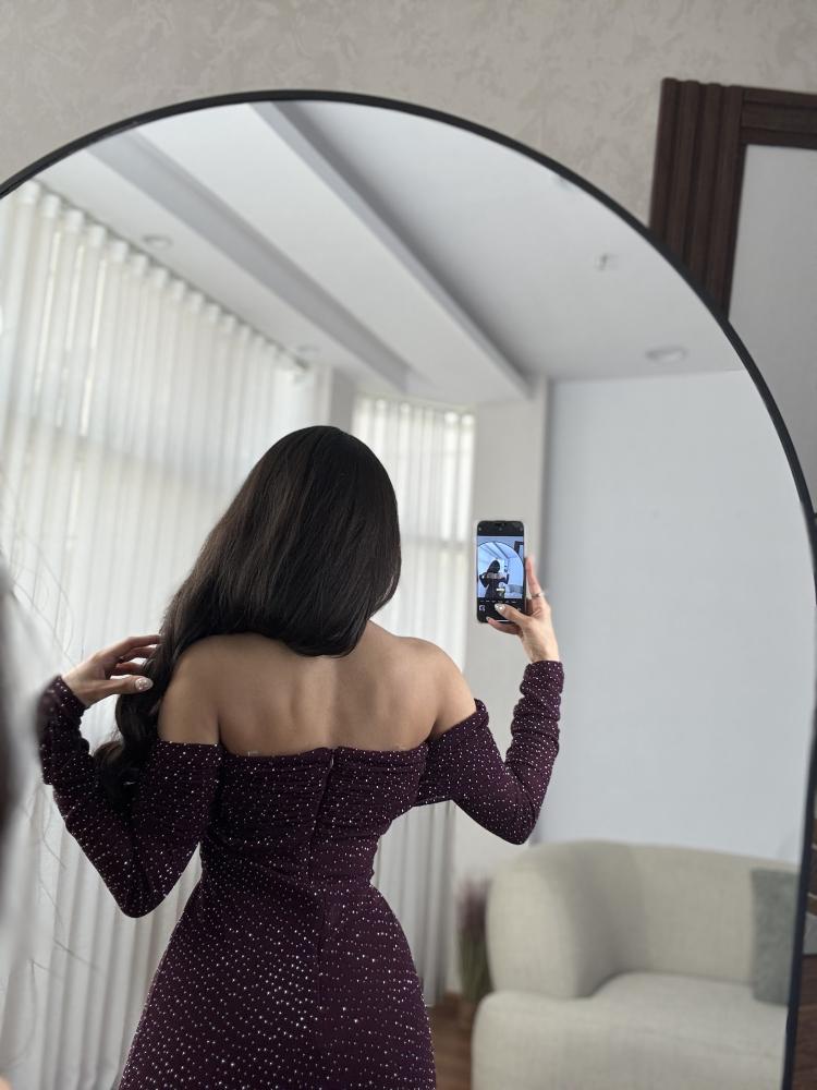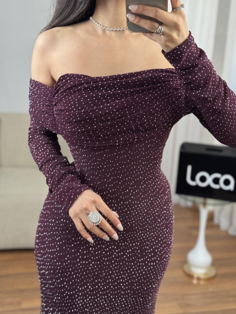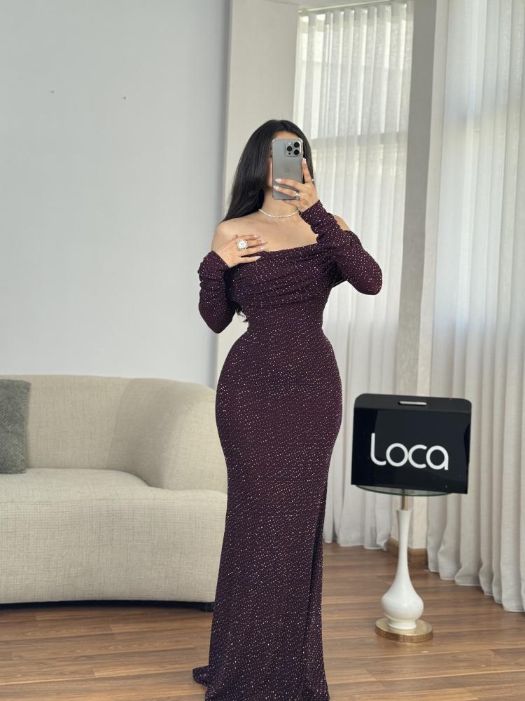 تميّزي بإطلالة ساحرة تخطف الأنظار بهذا الفستان البنفسجي العميق المزين بالكامل بفصوص لامعة تضيف لمسة من التألق والرقي. قصة ضيقة تبرز جمال القوام، وتصميم الأوف شولدر يُضفي نعومة وأناقة فريدة تليق بأجمل السهرات والمناسبات الخاصة.