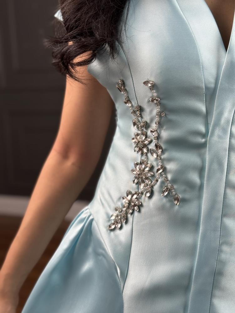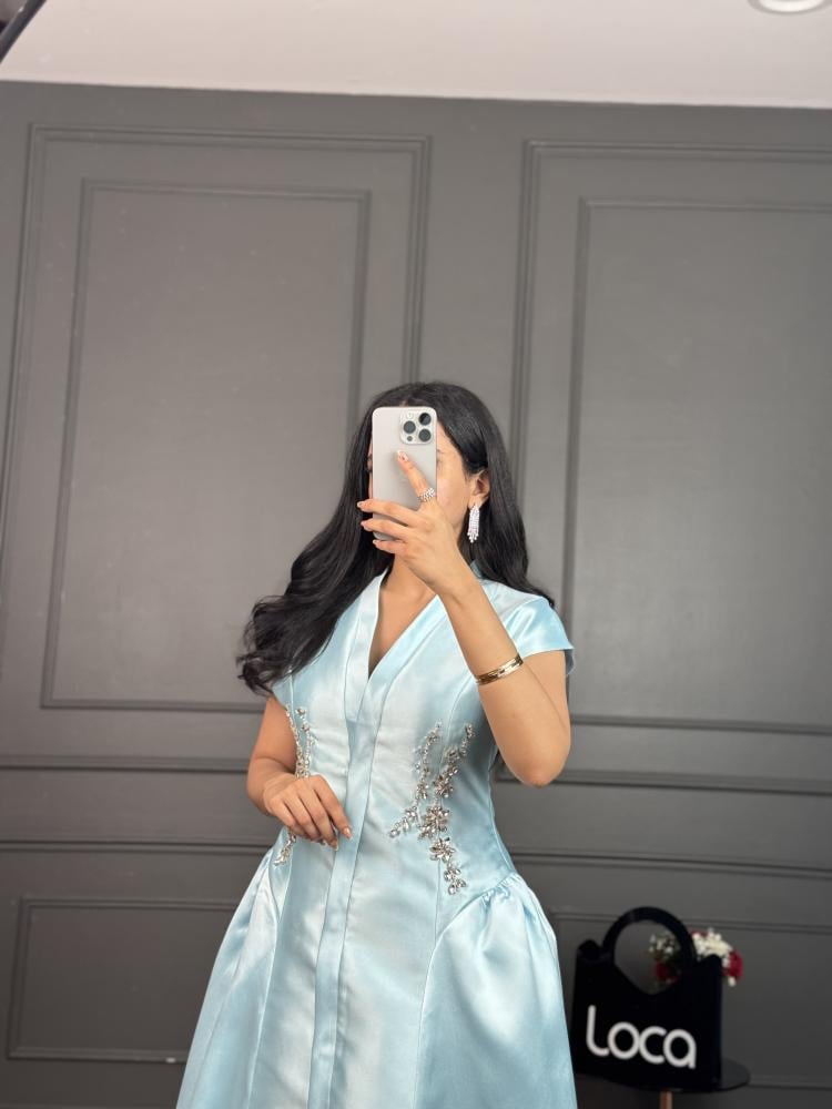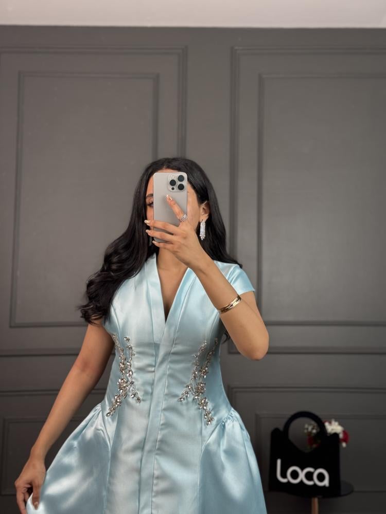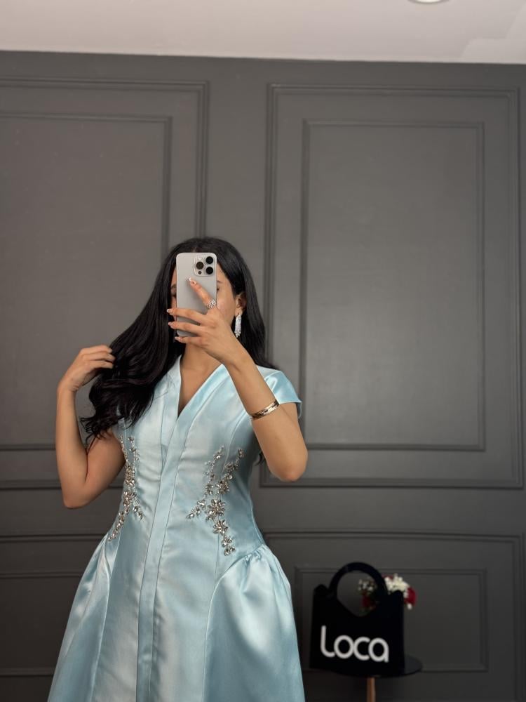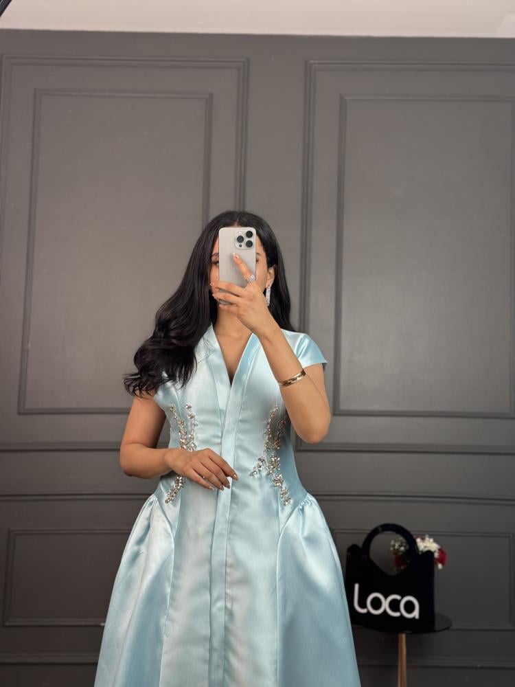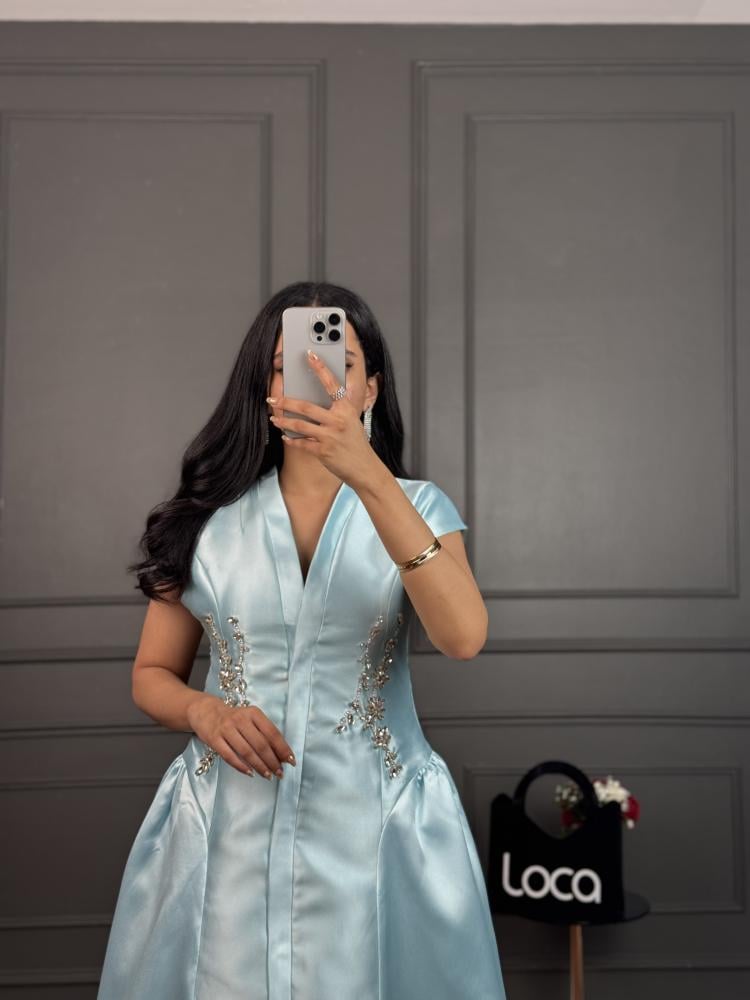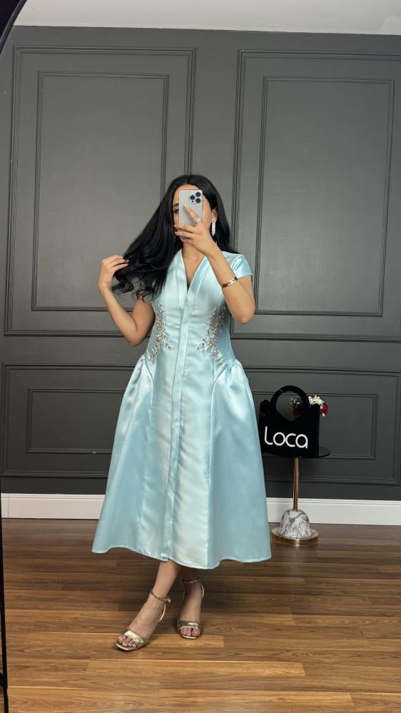 فستان ميدي وبتطريز انيق ولون تيفاني من لوكا فاشن