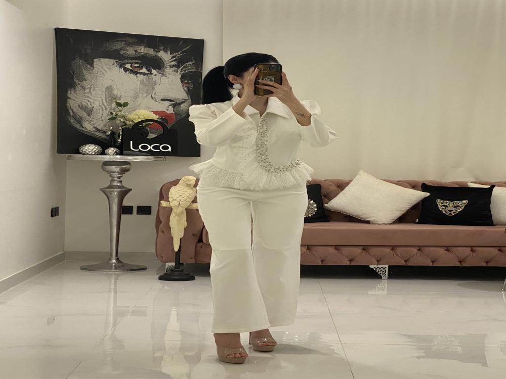 اطلبي الان :طقم بلوزه وبنطلون باللون اوف وايت