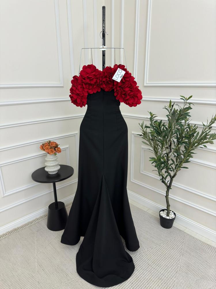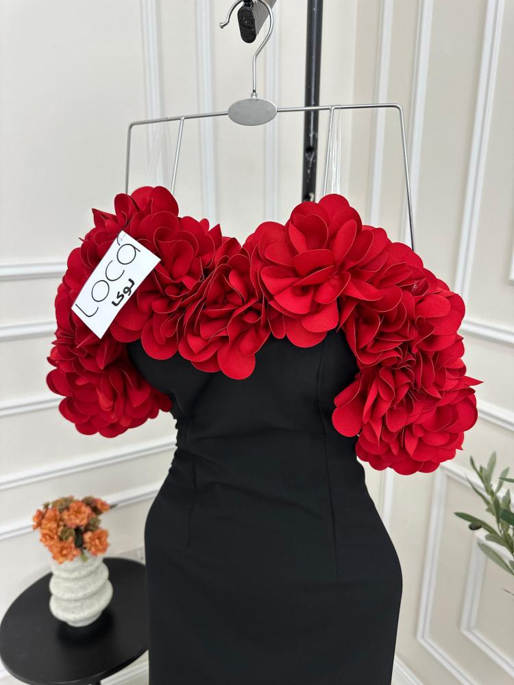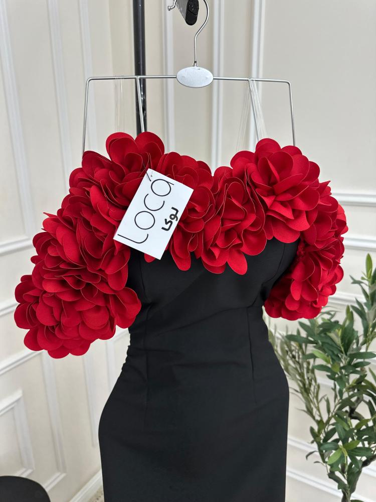 فستان اسود مع ورد احمر