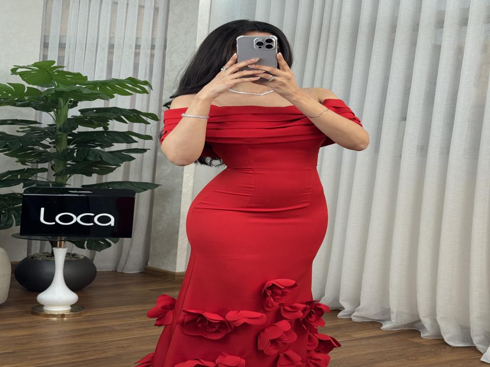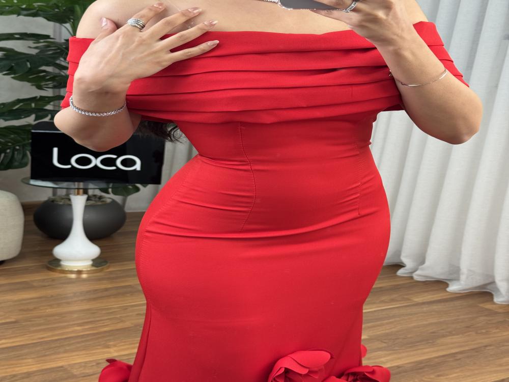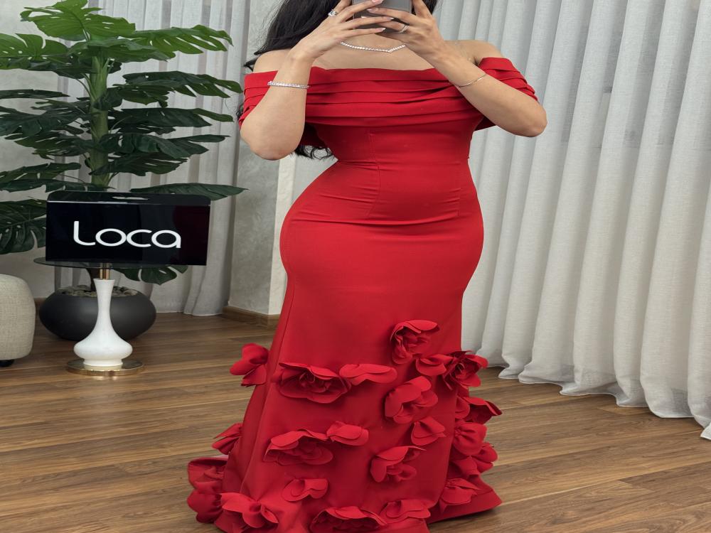 اطلبي الان : فستان سهره مميز ميزن بورود جميله وباكمام اوف شولدر ولون احمر جذاب من براند لوكا فاشن