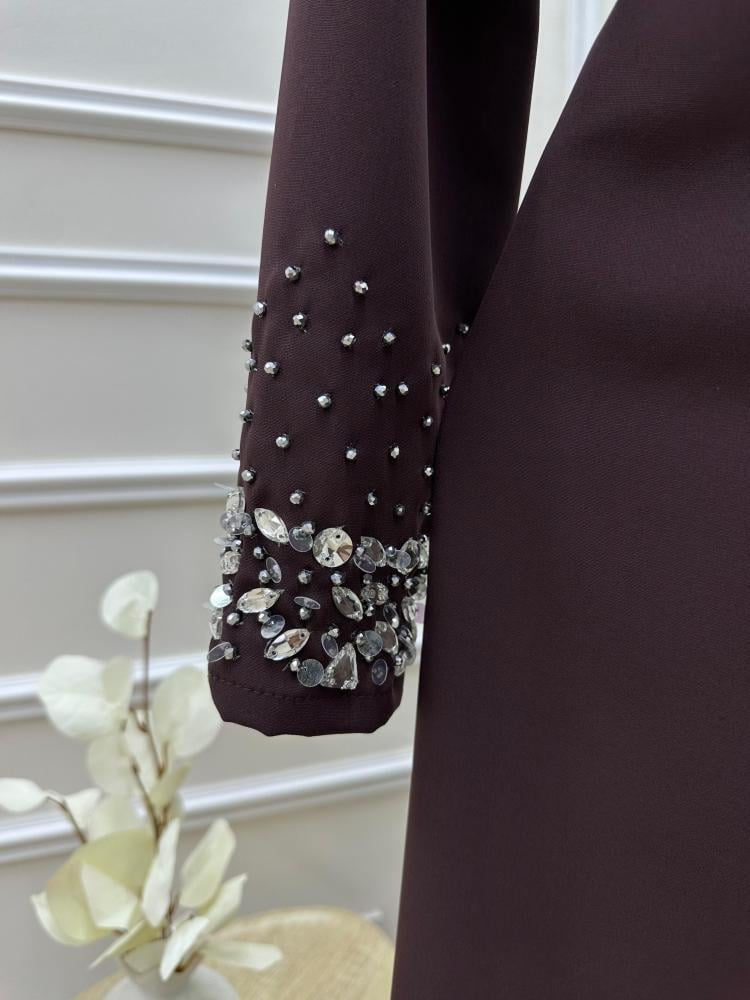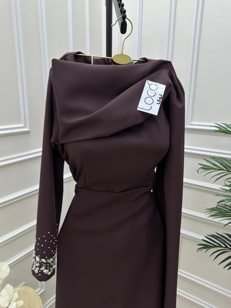 الفستان سهره ناعم يتميز بلون الهبه موكا موس ، مما يعطيه لمسة من الأناقة والدفء. التصميم يحتوي على أكمام طويلة، مما يجعله مناسبًا للمناسبات المسائية.