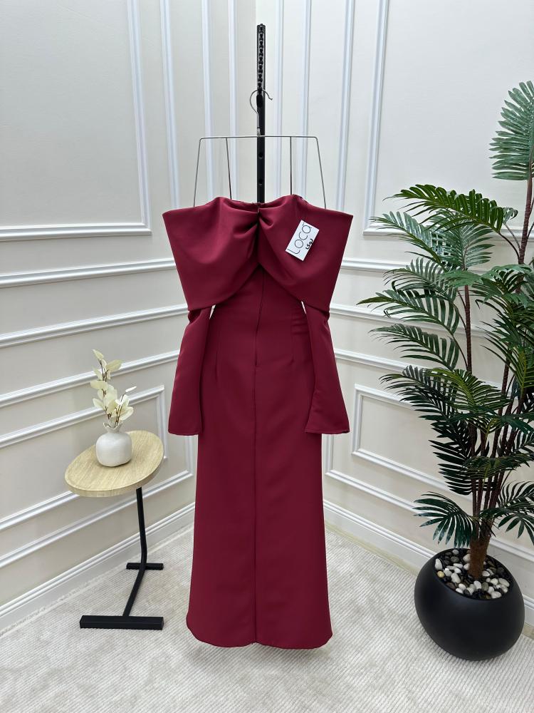 هذا الفستان العودي الأنيق يتميز بقصة ماسكة للجسم. قصة الصدر هي قصة اوف شولدر بسيطة وأنيقة، مع أكمام طويله تضفي لمسة من الرقة والأنوثة.