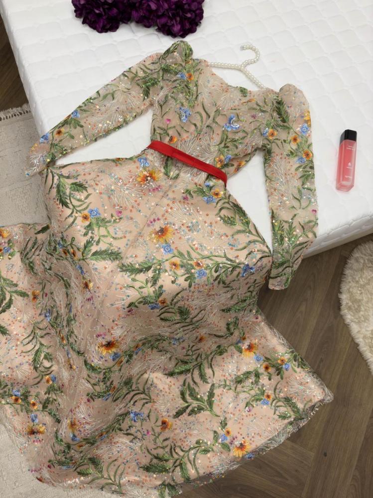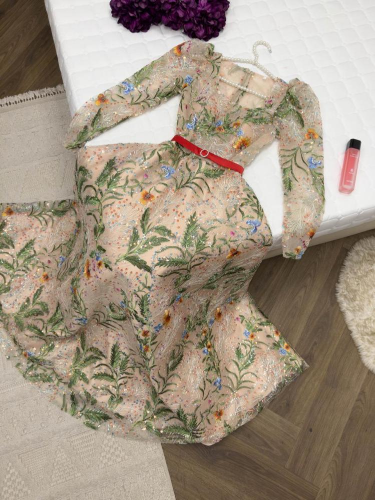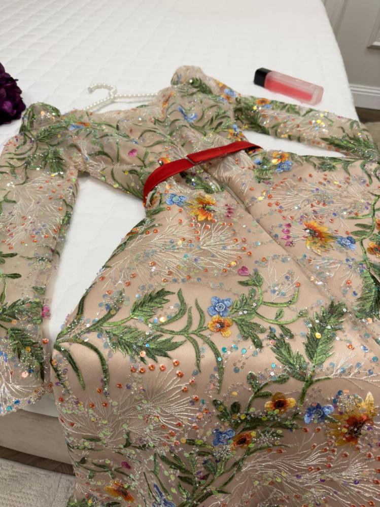 فستان ساحر مستوحى من الطبيعة بألوانه ورسوماته، يتميز بتطريزات نباتية وزهور ملونة موزعة بدقة على كامل القماش لتمنح إطلالة فاخرة وملفتة. التصميم بقصة ضيقة من الأعلى مع إبراز الخصر بحزام أحمر ناعم يضيف لمسة أنوثة رقيقة، وتنورة واسعة تنسدل برقي لتعطي حرية وأناقة أثناء الحركة