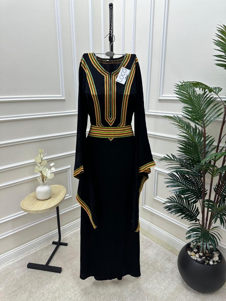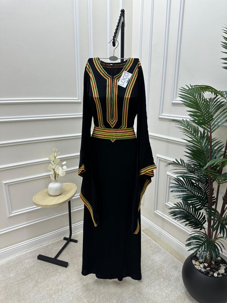 التطريز: يحتوي على تطريزات ملونة بألوان زاهية، مثل الأحمر والأخضر والذهبي، مما يضفي حيوية على التصميم.