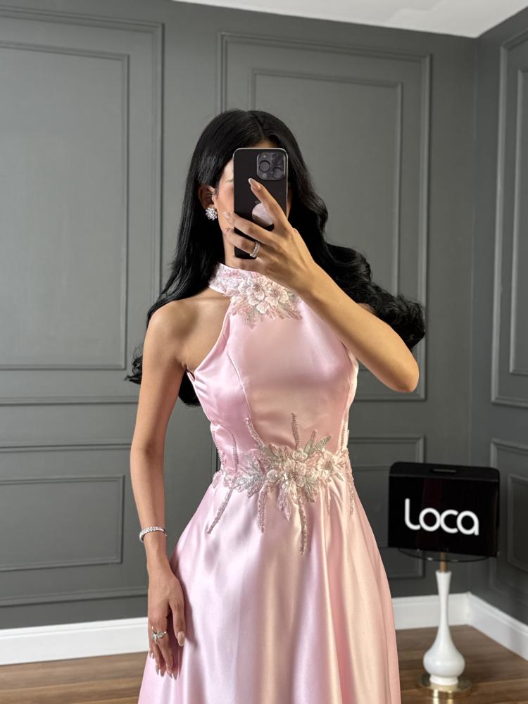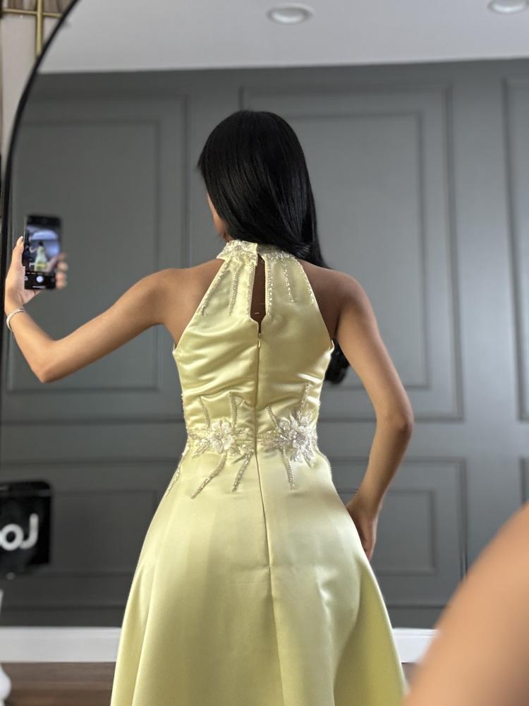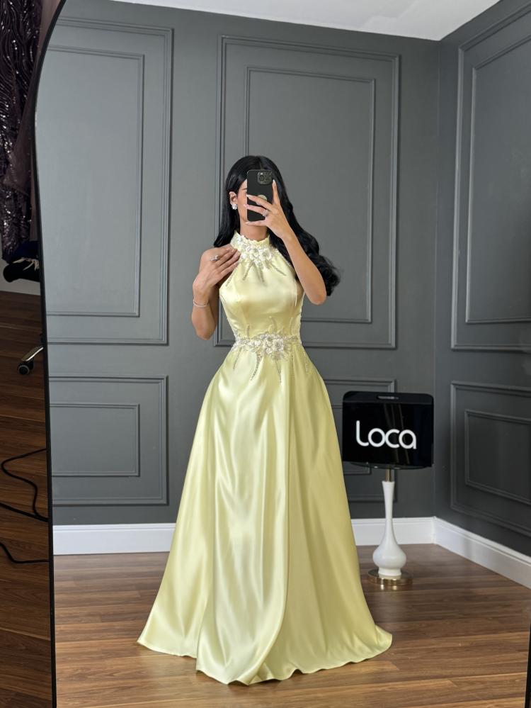 أبهري كل الأنظار مع هذا الفستان الراقي المصنوع من قماش الساتان الفاخر بلمعته الناعمة التي تعكس الفخامة والرقي. يأتي بتصميم هالتر أنيق مع تجمعات جذابة عند منطقة الرقبة، فيما يزين الخصر تطريز لامع يبرز جمال القوام ويضفي لمسة ملكية على الإطلالة. القصة كلوش واسعة تنساب بانسيابية لتمنحك حضوراً ساحراً وحركة أنثوية ملفتة.