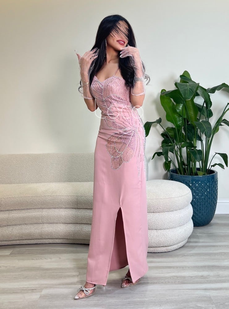 نوع التصميم: فستان وردي بتطريز على شكل فراشة