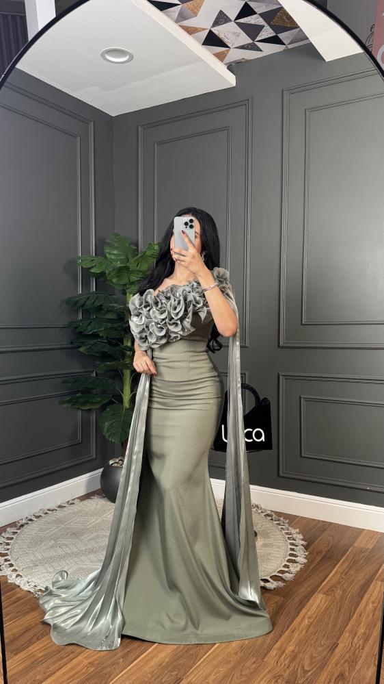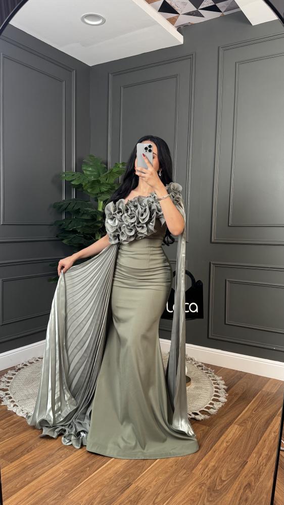 فستان سهره باللون الزيتي الفاتح وبتصميم يجذب الانظار من لوكا فاشن