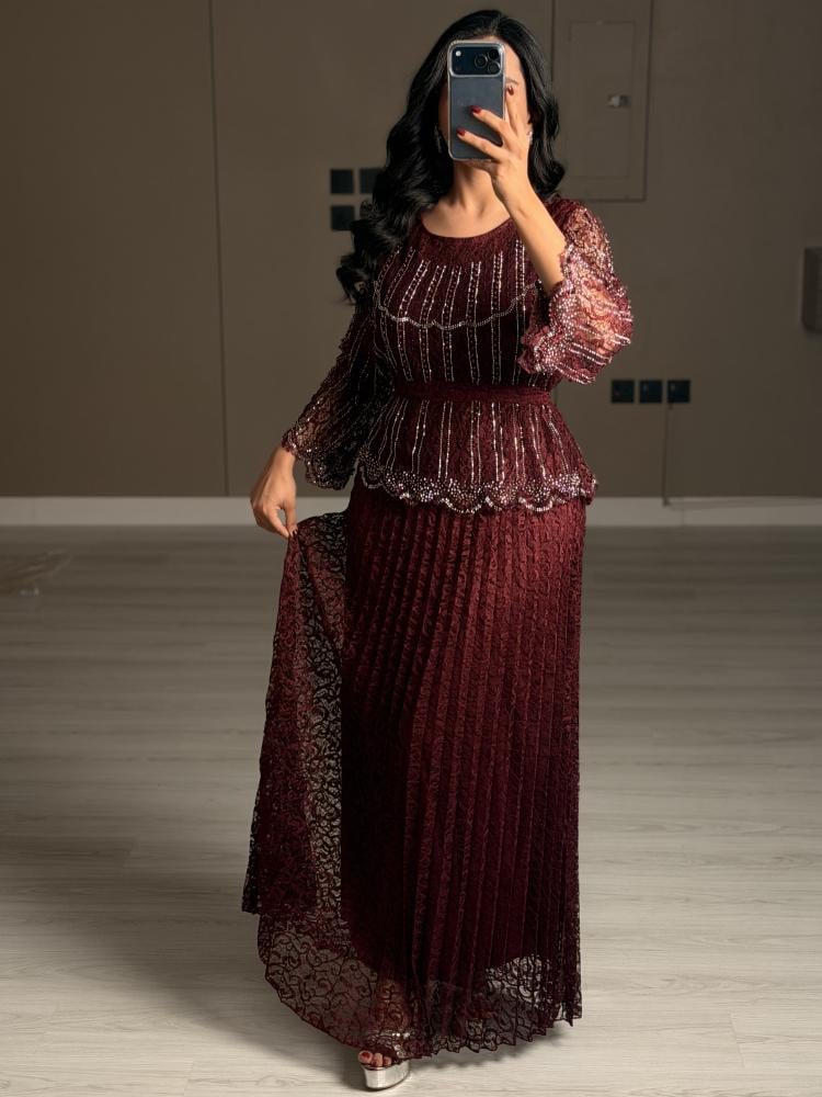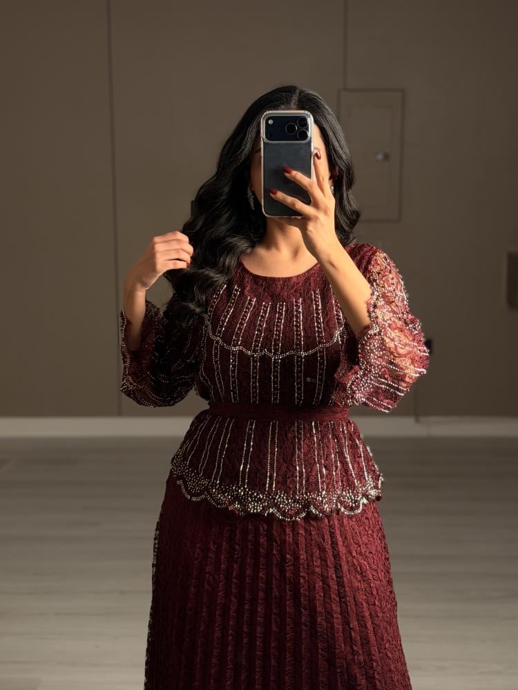 لون غني ومناسب للسهرات ويمنح فستان دانتيل عنابي حضورًا أنيقًا