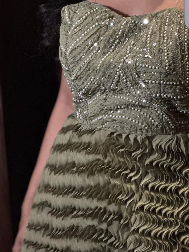 فستان سهرة زيتي مخمل بتفاصيل لامعة وذهبية فاخرة
