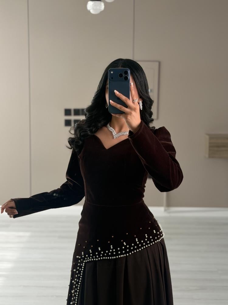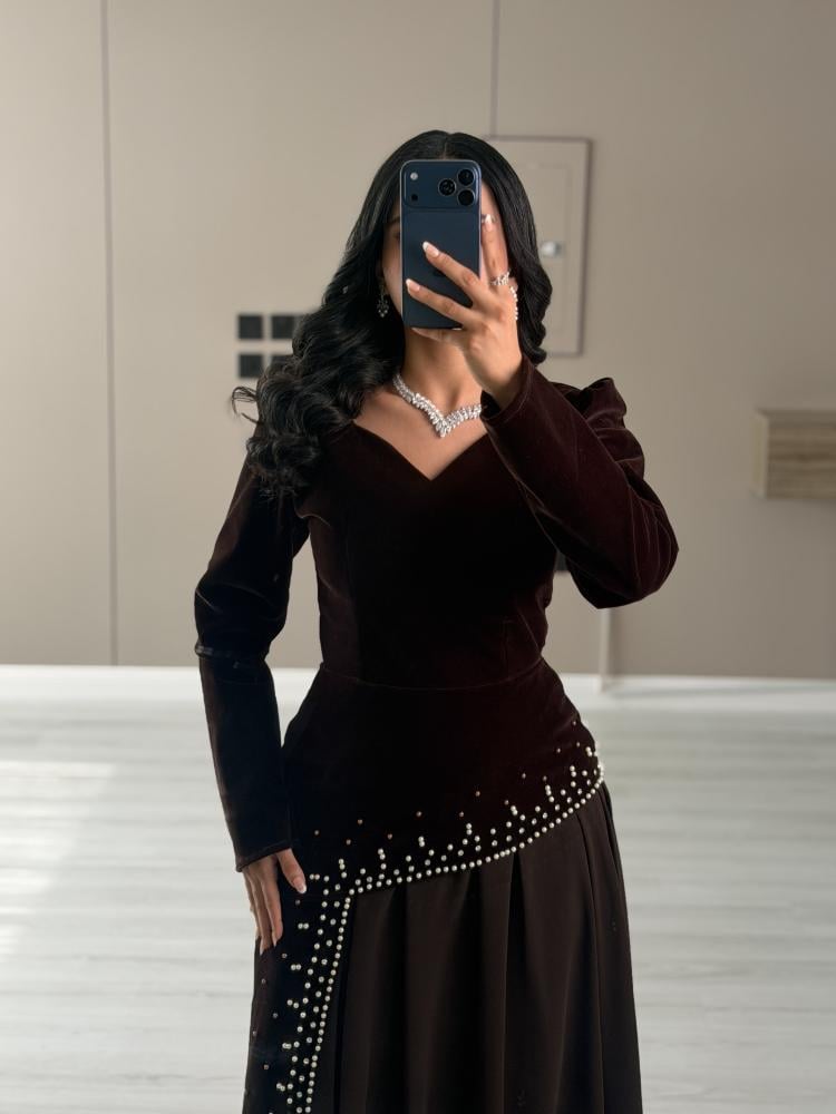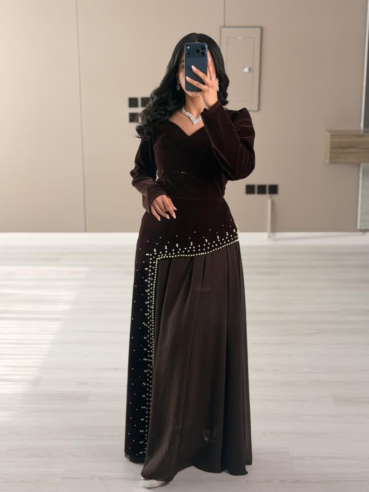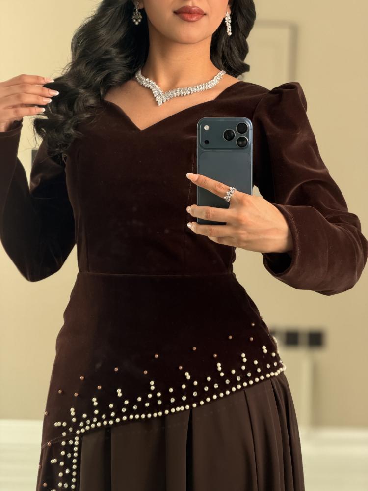 اختاري فستان سهرة مخملي طويل لون بني غامق مزين بالخرز ودعي إطلالتك تعكس دفء الشتاء وفخامة السهرة، أضيفيه الآن إلى سلتك وتألقـي بأسلوب راقٍ مع متجر لوكا للفساتين.
